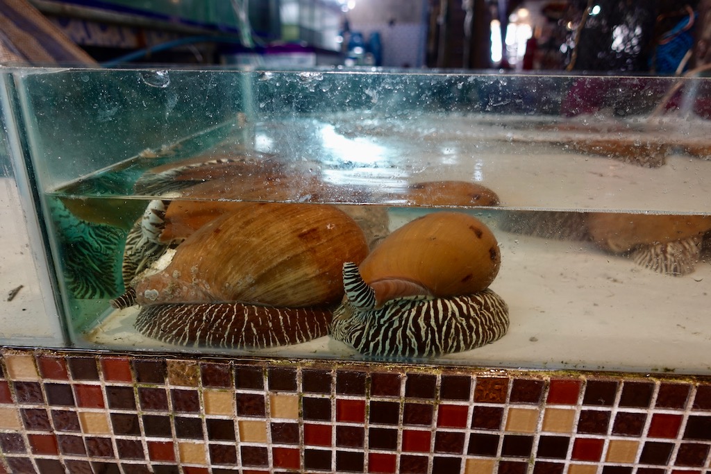 When we arrived in Koh Chang, we docked at Bang Bao Pier. The pier is connected to a large, covered marketplace lined with shops and restaurants displaying their live seafood in front. We chose a restaurant called Chowlay Seafood, where Cindy had previously infamously ordered a "cold towel", thinking it was some sort of cocktail. (It was not. It was a cold towel.) We ate scallops, fish bites, and oysters, which were served out of their shells, resting on a dome of ice.